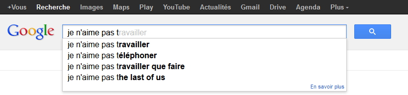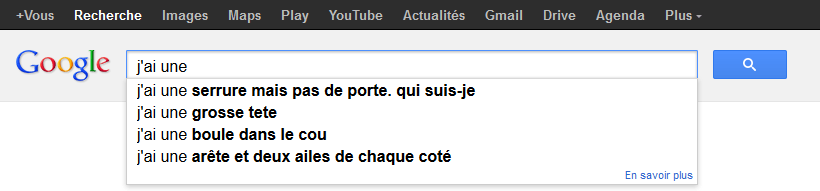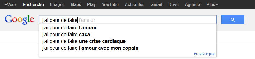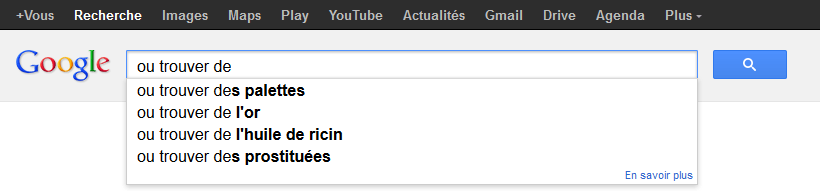 Les suggestions de recherche Google sont sensées nous aider en ajoutant le nom de notre ville (trouvé grâce à l’IP), refléter les recherches des autres internautes, mais elles sont parfois surprenantes… C’est presque devenu un jeu ou on essaye de savoir ce que Google propose avec des recherches basiques. Comme ici ou on voit des propositions en tout genre.